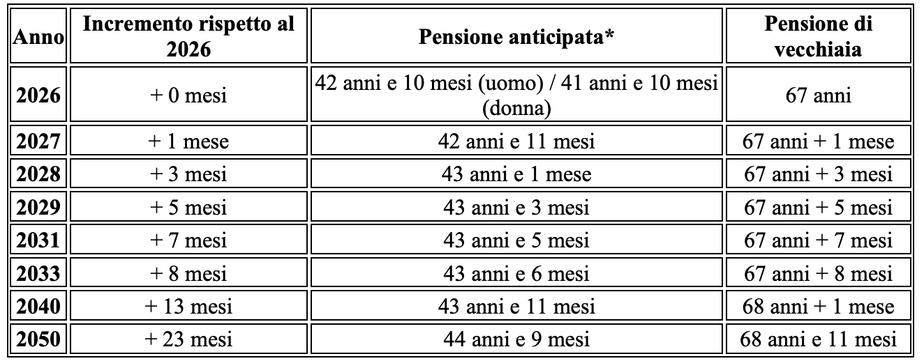 La Manovra non blocca il meccanismo di adeguamento all’aspettativa di vita. Dopo un incremento attenuato nel 2027 (+1 mese), dal 2028 gli aumenti tornano a regime: +3 mesi nel 2028, +5 mesi nel 2029, fino a +23 mesi nel 2050. Il risultato è che chi oggi ha redditi bassi dovrà lavorare settimane o mesi aggiuntivi solo per “recuperare” l’aumento previsto.